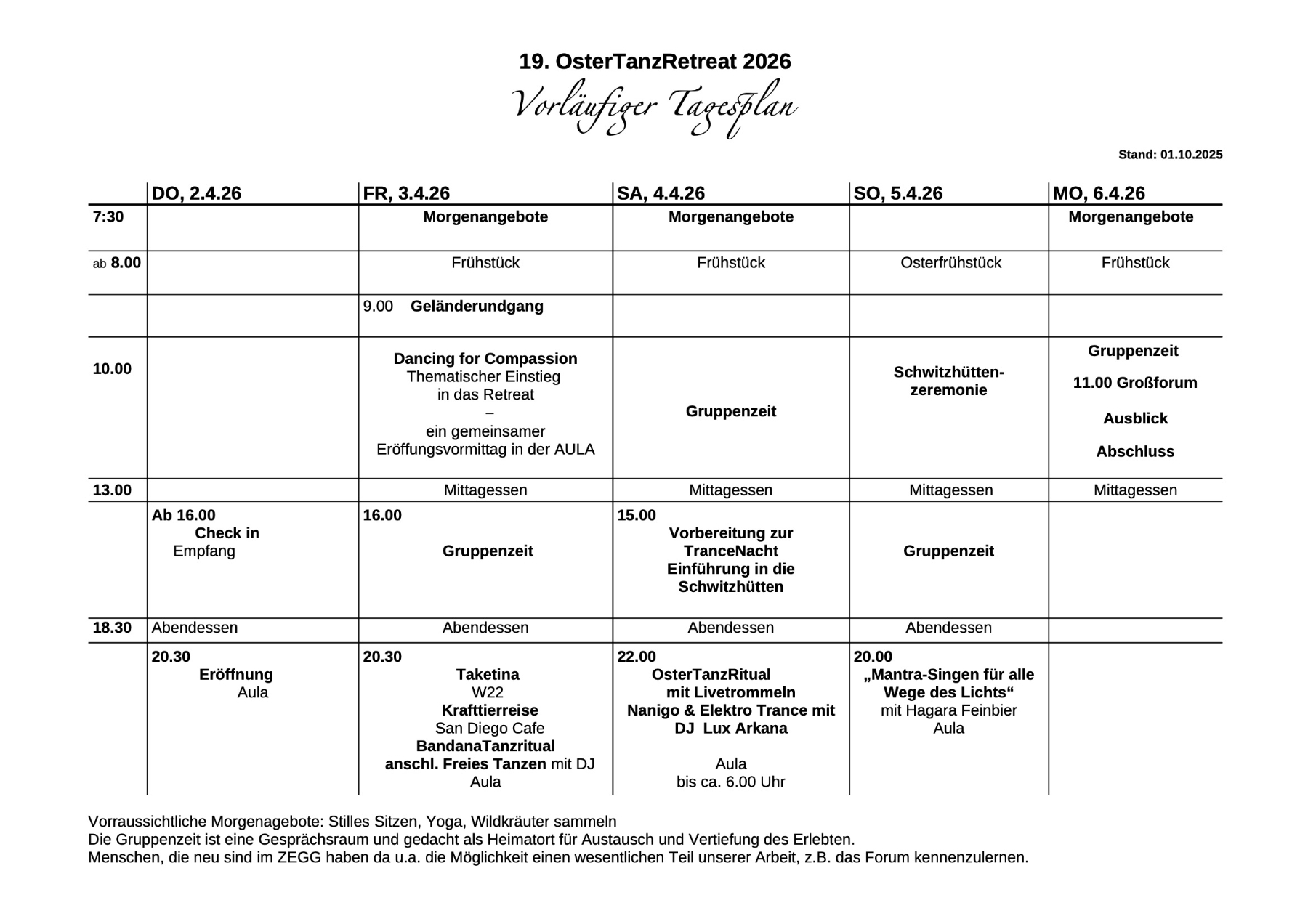 Achtung!!! Dieses Retreat geht vom 2. bis zum 6. April. In unserer Printwerbung (ZEGG-Jahresprogramm) haben wir versehentlich den 5. als End-Datum heraus gegeben.
